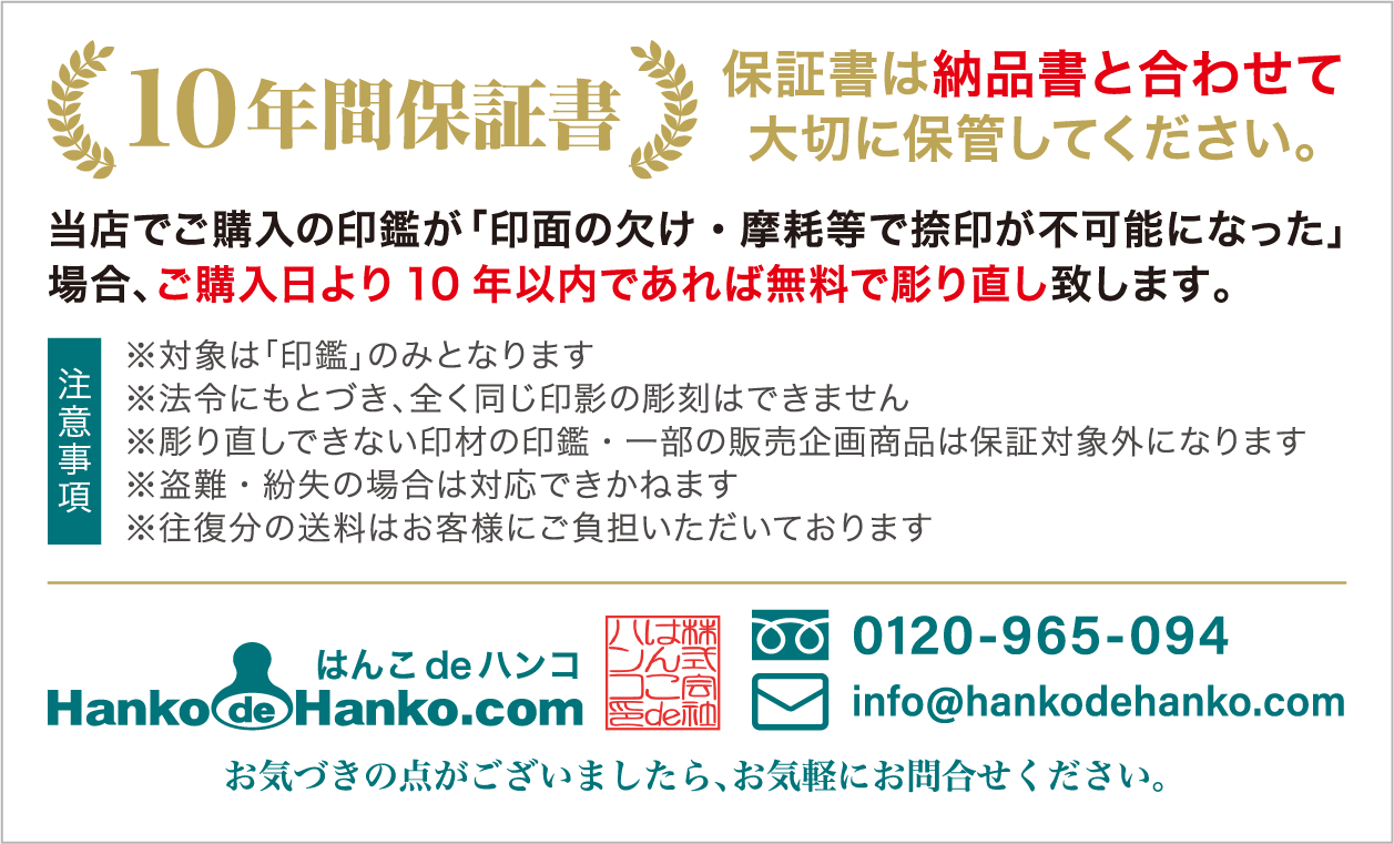 「印面の欠け・摩耗等で捺印が不能になった」場合、ご購入日より10年以内であれば無料で彫り直し致します。