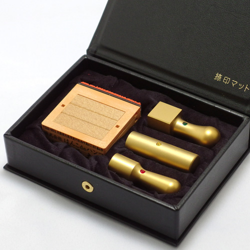 従来のチタンにアメリカの宇宙開発技術として発明された「イオンプレーティング」を施したIPチタン印鑑シリーズ。表面を少しざらつかせる「ブラスト加工」と「IPゴールド加工」を組み合わせることにより、ツヤ消しならではの重厚感溢れる仕上がりとなっています。