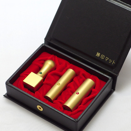 従来のチタンにアメリカの宇宙開発技術として発明された「イオンプレーティング」を施したIPチタン印鑑シリーズ。表面を少しざらつかせる「ブラスト加工」と「IPゴールド加工」を組み合わせることにより、ツヤ消しならではの重厚感溢れる仕上がりとなっています。