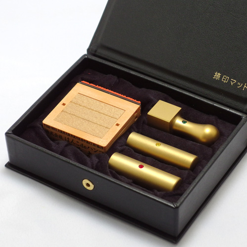 従来のチタンにアメリカの宇宙開発技術として発明された「イオンプレーティング」を施したIPチタン印鑑シリーズ。表面を少しざらつかせる「ブラスト加工」と「IPゴールド加工」を組み合わせることにより、ツヤ消しならではの重厚感溢れる仕上がりとなっています。