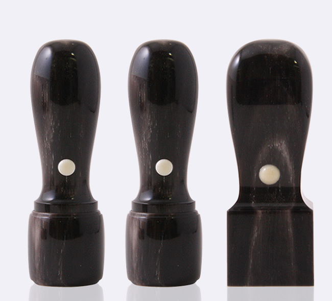 印材としての素材特性、コストパフォーマンス、質感の高さを併せ持つ牙角系の印材では昔から最も好まれている印材です。耐久性にすぐれ、朱肉のつき具合や 押印性も高く、手にしっくりと来る重量感と漆黒の締まりのある姿に映える朱の印面の姿にご満足いただけるかと存じます。黒水牛[ナチュラル]は一般的に 「染無」と呼ばれるもので、天然の美しさが魅力です。