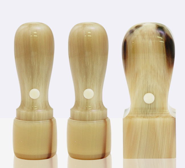 艶のある独特の質感と茶褐色の「ふ」と呼ばれる模様により、1本1本が多様な色合いを出す美しい印材です。水牛の角を加工した印材の中でも耐久性や押印性 に特に優れています。オランダの植民地であったタイ産の水牛の角を使用していたことからオランダ水牛と呼ばれていますが、現在では主にオーストラリア産の 水牛の角が使われています。
