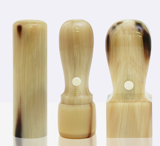 艶のある独特の質感と茶褐色の「ふ」と呼ばれる模様により、1本1本が多様な色合いを出す美しい印材です。水牛の角を加工した印材の中でも耐久性や押印性 に特に優れています。オランダの植民地であったタイ産の水牛の角を使用していたことからオランダ水牛と呼ばれていますが、現在では主にオーストラリア産の 水牛の角が使われています。