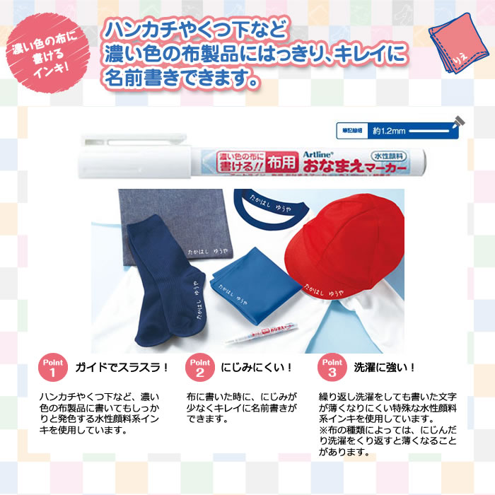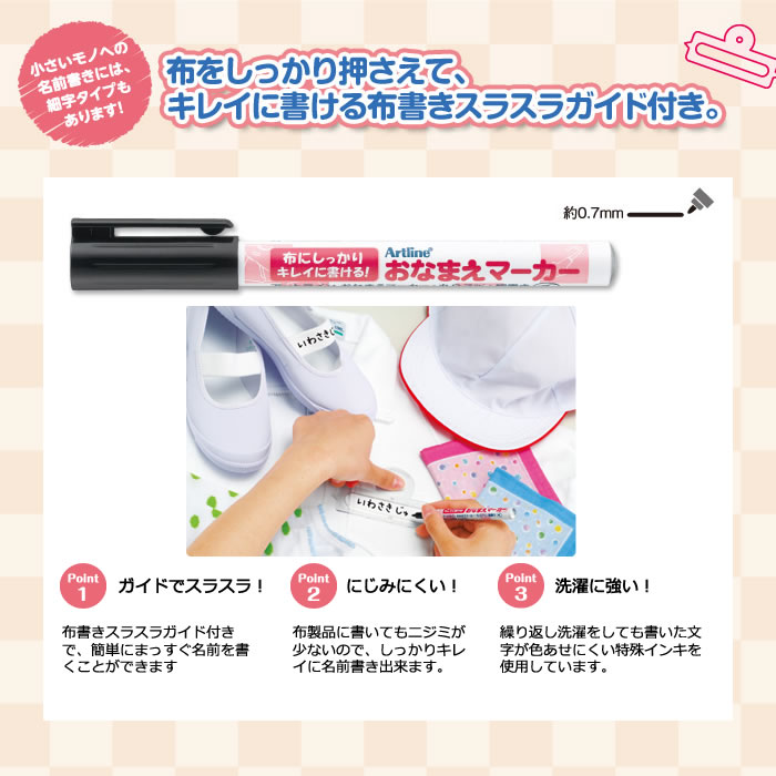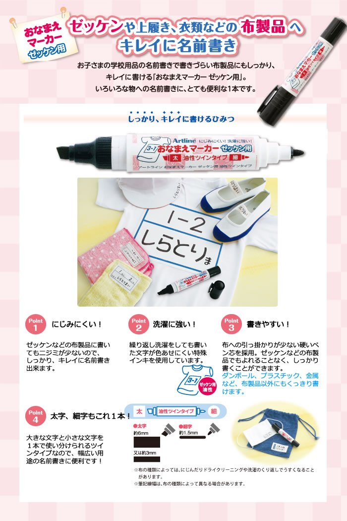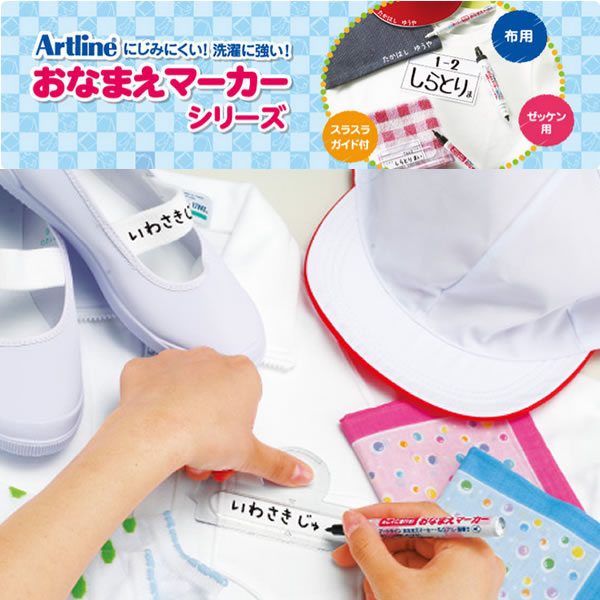 ゼッケンや上履きなど布製の学校用品にも、しっかり、くっきり名前書きできます。