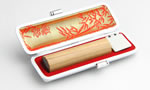 柔らかく密度差の大きい杉材を、高圧水蒸気を用いた圧密化加工をすることで、比重を高め、印面の堅さや高い均質性を実現しています。天然素材を100%活かし、木目の美しさと自然の風合いはもちろん、ほのかな杉の趣きある香りが癒しを与えてくれます。