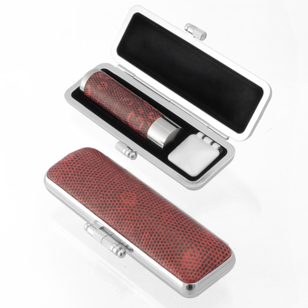 最新の金属加工機で彫刻することで、滑らかで鮮明な仕上がりが得られます。 本トカゲケースとのセットとなっております。 ・素材:リザード(本トカゲ) ・カラー:赤 ・フレーム:シルバー ・内張り:ベルベット ・朱肉付き |