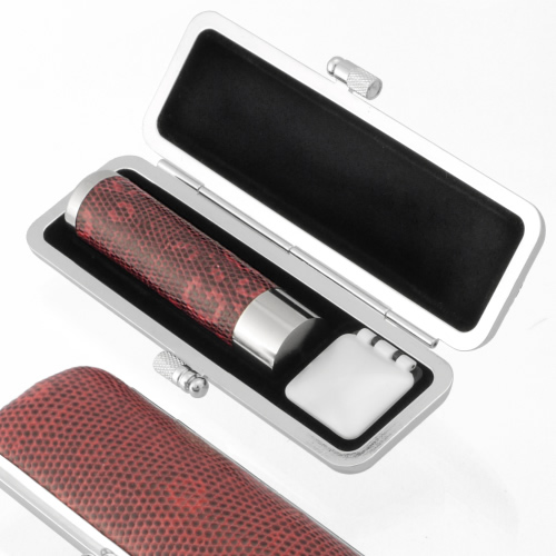 最強の強度を持ち、捺印がきれいにできると好評のチタン印鑑に、天然皮革として高い人気を誇るリザード(トカゲ)革を巻いたチタン印鑑が登場しました。