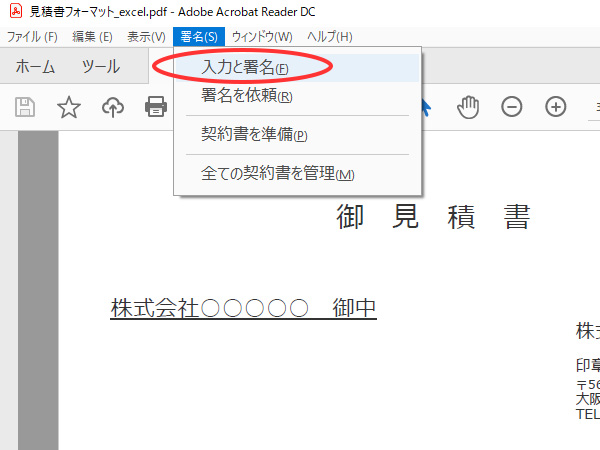 ①対象のPDFファイルを開き、メニューの「署名」→「入力と署名」→を選択