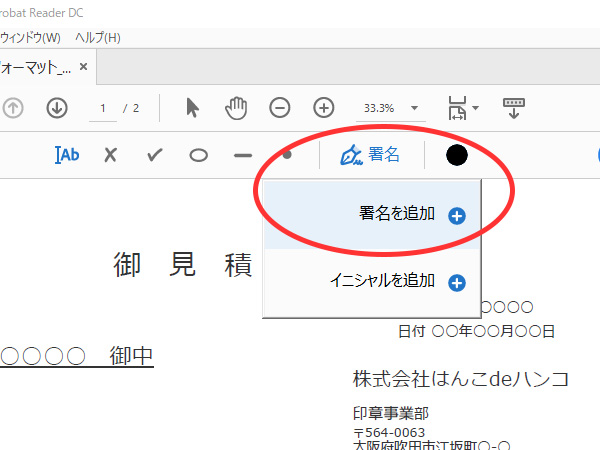 ②編集バーが表示されますので、「署名」→「署名を追加」を選択