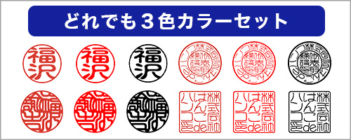 電子印鑑は実際の朱肉に近い「朱色」、PC画面や印刷でくっきりと映える「濃い朱色」、モノクロ印刷用の「黒」の3色をセットでご用意いたします。