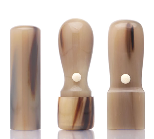 艶のある独特の質感と茶褐色の「ふ」と呼ばれる模様により、1本1本が多様な色合いを出す美しい印鑑素材です。「ナチュラル」はオランダ水牛の中でも「ふ」の混じりが多く、個性的な色合いを楽しみたいかたにおすすめです。