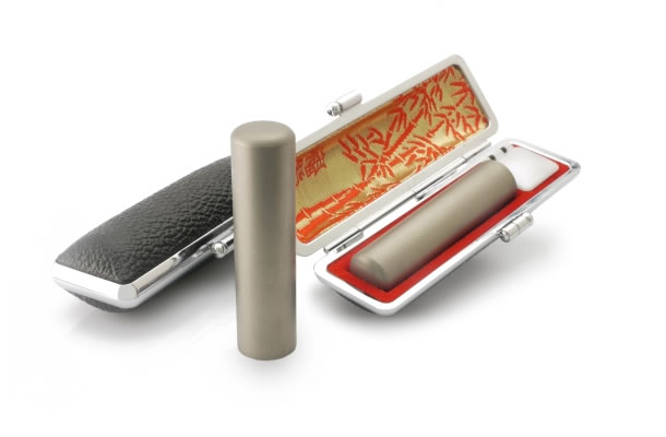 先進のマテリアル超金属として、宇宙工学や先進医療に活躍しているチタン製の印鑑です。当店では純度99%以上の純チタンを採用し、数ある印材の中でも押印性、耐久性・耐食性・耐熱性など群を抜いています。表面をざらつかせるブラスト加工を施しており、手にしっくりなじむ重量感、まさしく一生ものの印鑑として自信を持ってオススメできる素材です。