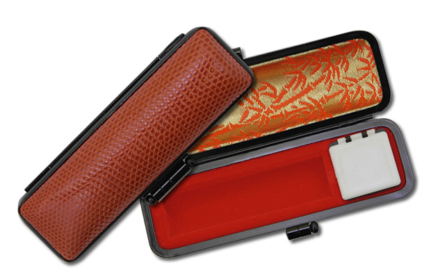 ねばりと光沢のあるトカゲの皮を使った高級感のあるケースです。ブラックの外枠をあしらい、豪華ながらも落ち着いた外観です。傷や汚れを防ぎ、大切な印鑑を長持ちさせてくれます。