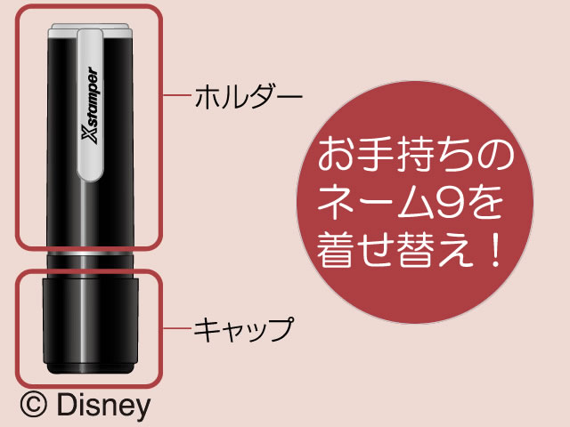 ディズニーキャラクターでデザインされたネーム9専用「クリップホルダー」と「キャップ」のセットです。