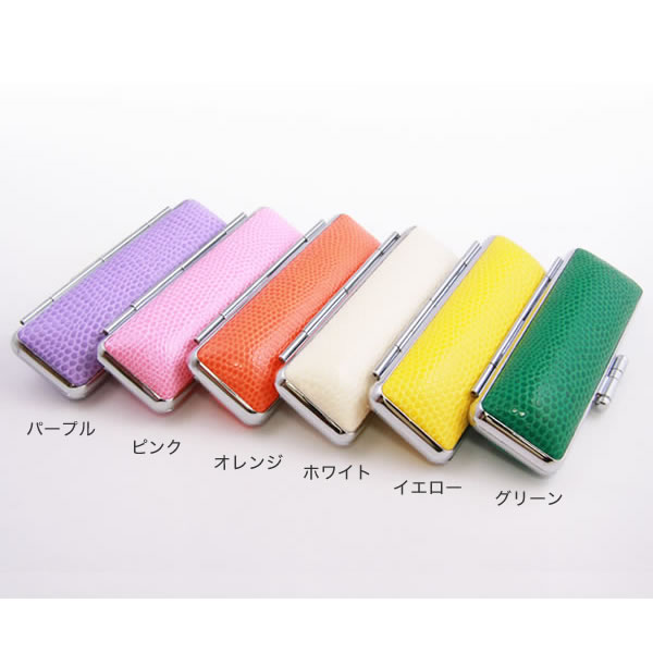 カラフルに染め上げた牛皮の表面にトカゲ皮模様を施した人気のケース。明るい色合いで、裏地もカジュアルな印鑑ケースです。